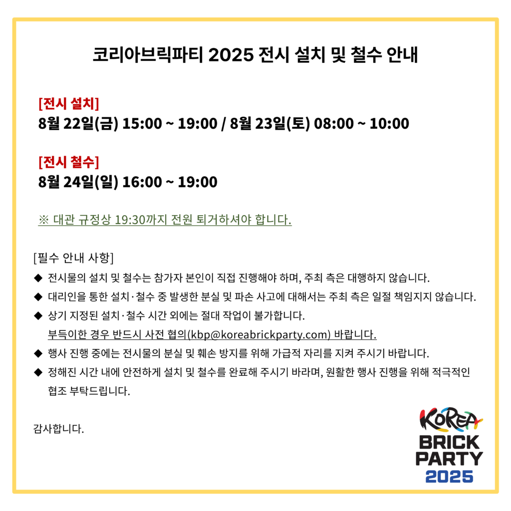 - 상기 지정된 설치·철수 시간 외에는 절대 작업이 불가합니다. 부득이한 경우 반드시 사전 협의(kbp@koreabrickparty.com) 바랍니다.